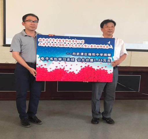 雍阳中学以弘扬中华优秀传统文化为契机,以“学国学诵经典”活动为阵地,积极打造校园文化环境,将“传承文化之风,熔铸品质教育”植入于德育教育工作中。学校利用宣传展板、黑板报、橱窗等宣传阵地,精心布置有关国学经典、警句、诗词歌赋等内容,电子展屏设计了修身立德的儒雅诗句,营造出校园内外处处书香飘溢良好传统文化氛围,让更多的学生了解、喜爱传统文化,提升学生文化素养,成为优秀传统文化的承载者和传播者。今天,由天津市“学国学 诵经典”公益活动组委会、天津光彩事业促进会和北京北斗科技有限公司的领导馈赠给我们100套国学经典电子书,让同学们更好地学习和掌握国学知识。王长明校长代表全体师生,真诚地感谢北京北斗科技有限公司对学校的支持。