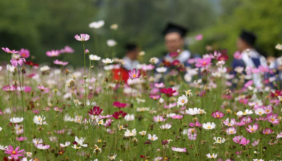 6月26日,南京中医药大学仙林校区内大片花海迎风绽放,粉色、白色、黄色的格桑花铺天盖地,让人仿佛置身在画卷中。