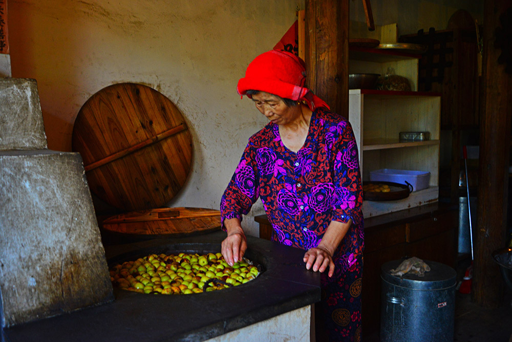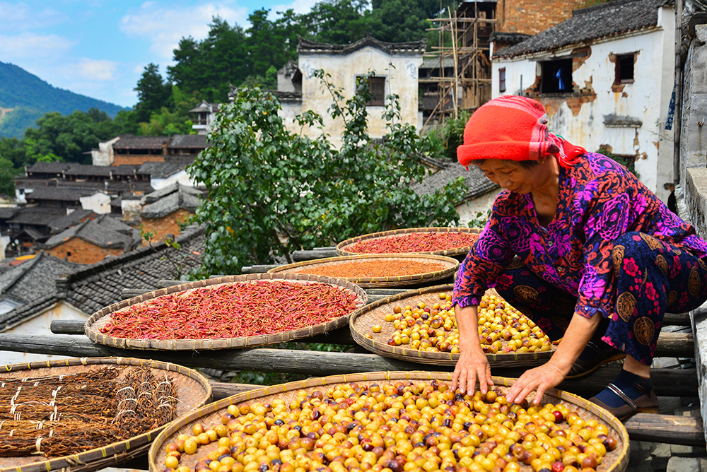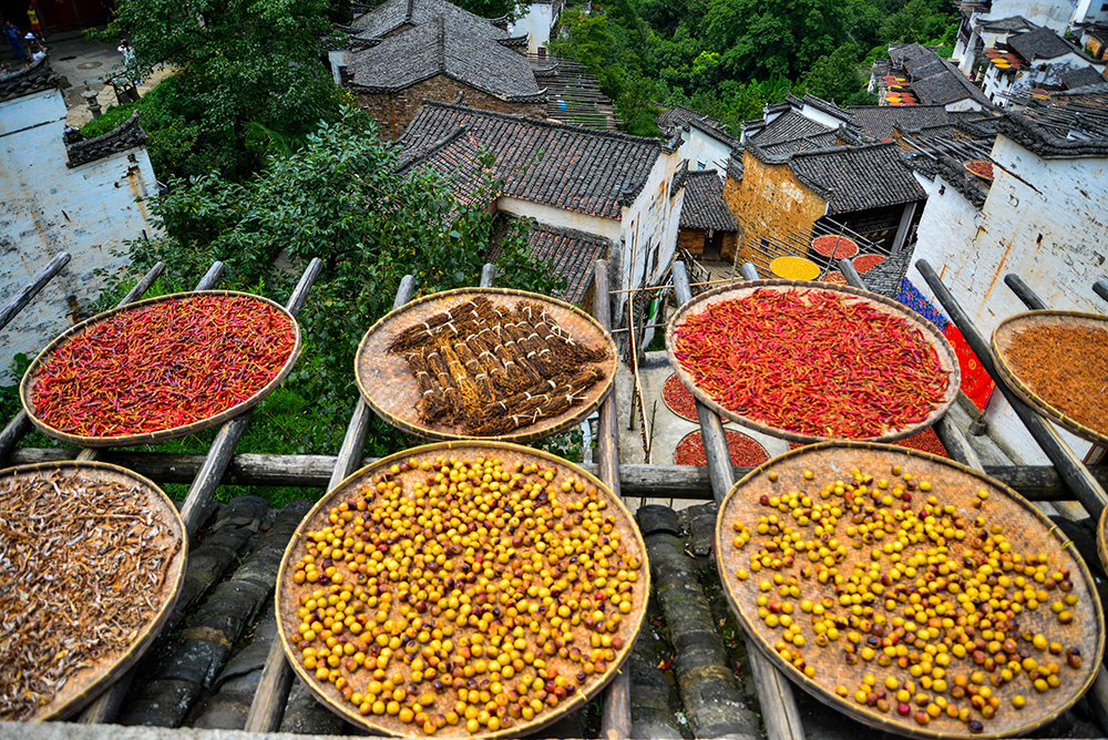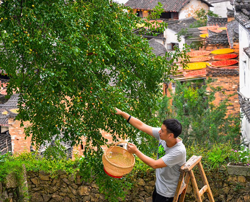 秋季是收获的季节,篁岭晒秋人家房前屋后枣树上的蜜枣成熟,村民们“打枣迎秋”,将盈余的枣子蒸熟,晾晒在古村晒架上。鲜红诱人的蜜枣给古村增添色彩,吸引游客的眼球。