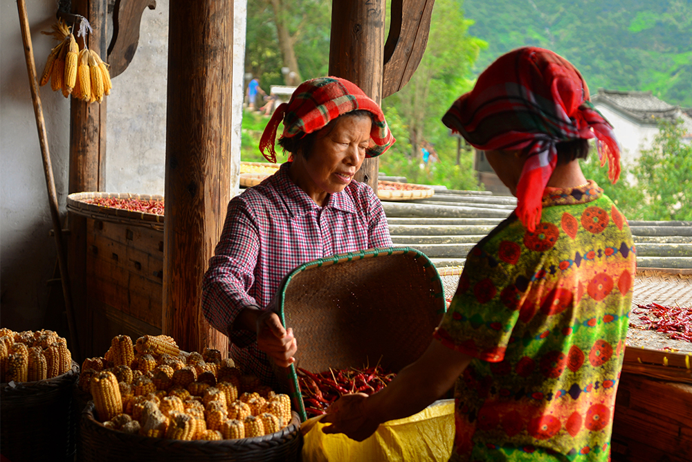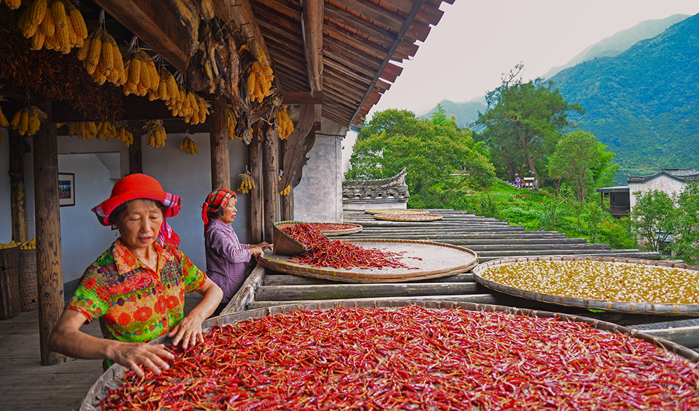 篁岭的秋景是从田间爬上晒架开始的。立秋之后,篁岭的各类瓜果作物逐渐成熟了,梯田上的朝天椒和玉米在处暑之时迎来丰收,晒秋大妈们一早便开始“抢收抢晒”。金黄的玉米棒和鲜红的朝天椒将整个篁岭古村装扮得更加五彩斑斓。
