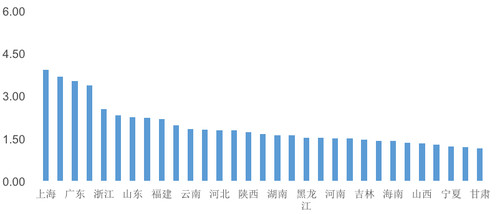 东南沿海和中西部发展较快的省份构成第二梯队(综合得分为1.5-3分)。浙江以2.53的得分位居第二梯队之首。