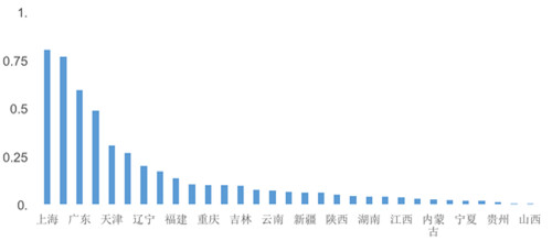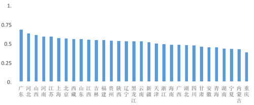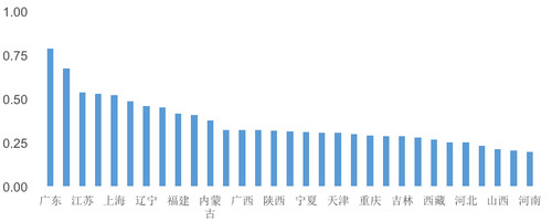 “国际人才创新指数”是对国际人才在创新发展和创新贡献方面的预期成效进行评估。广东(0.68)、江苏(0.59)、上海(0.56)和北京(0.56)表现相对较好,这体现出对国际人才集聚区域的创新能力预期相对较高。