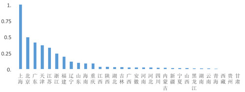 在其二级指标“国际人才创新基础指数”中,陕西(0.69)、贵州(0.63)、西藏(0.63)等西部地区得分相对较高,即国际人才来源国和所涉及行业领域的创新能力相对较强,这与该地区引进国际人才具有明确导向性有重要关系。北京(0.60)、广东(0.53)和江苏(0.50)在市场化引进国际人才时,其国际人才创新基础仍然保持靠前。但上海此指标的得分不高,为0.39。分析显示,这与上海所引进的国际人才主要集中在金融领域,与信息技术、高端制造等其他领域的创新潜力相比偏弱相关。