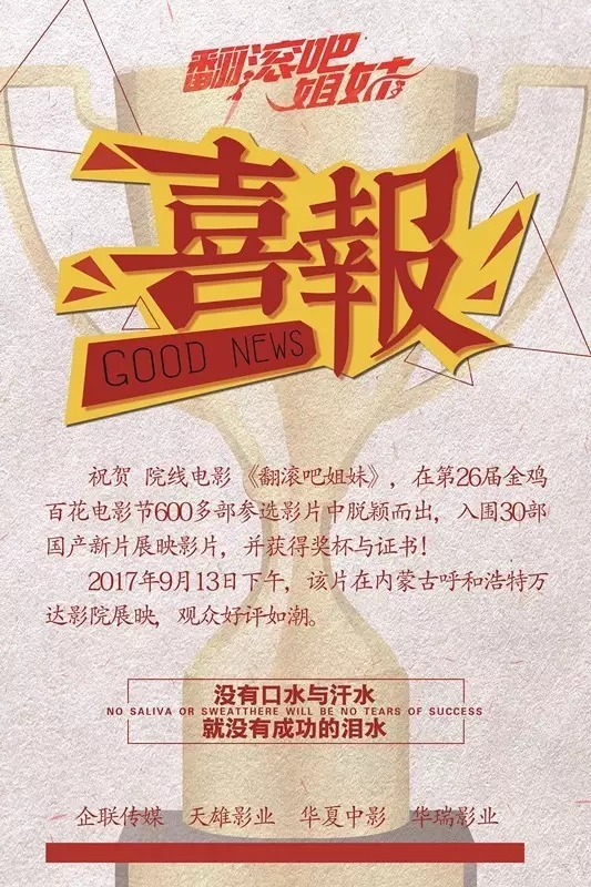 2017年9月13日,第26届中国金鸡百花电影节,在内蒙古自治区呼和浩特市乌兰恰特大剧院开幕。由企联传媒、天雄影业、华瑞影业联合出品,天雄影业、华夏中影联合摄制,周晓鹏监制,王钲编剧/导演的影片《翻滚吧姐妹》成功入围30部国产新片展映名单,并取得组委会及各界人士一致好评。