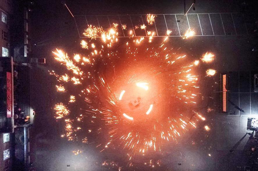 “铁树银花”民俗表演俗称“抡铁花”,“抡铁花”时需要先把木炭、灰铁按一定比例装在铁笼里并砸实,用喷枪将铁笼子里的木炭和灰铁点燃。等灰铁融化成铁水,高速转动的铁架将铁水甩出,形成流光溢彩的“铁树银花”。