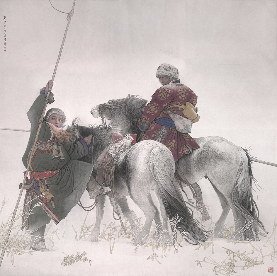李先生认为任何一个艺术家首先都应该从临摹中来,但又不能泥古不化,他说:“工笔人物画,我完整的临摹,几乎是不多,主要在于吸收。山水写生,前后大概是五年的时间,投入的精力远远没有工笔人物多,但是从这一个来原和我毫不相干的一个画科,迅速拉升到和我最强的草原工笔人物,它俩是同一个水准,大概这就是艺术共通之处吧。我更多的是在意临,就是找一张比较好的印刷品。在等飞机的时候,上火车的时候,或者是在开会的时候,我长时间的观看,甚至是看上几个月,比如说董源的《溪岸图》,每一次写生我都带着它,每一天甚至我都观察个最少二十多分钟或者是半个多小时,所以说临摹应该把它作为一个借鉴,最终我们并不是比的谁临多少张,而是看谁能够把它的内在的东西抓住。换句话说,对于任何优秀作品的鉴赏力和理解力就本质上来讲,是对前人密码的破译,如果谁破译了一些,在你的下一篇作品里面自然而然就会有这些意境的体现,破译的多,你的意境表达的就更充分一些,一点不懂,你临的再多,作品还是原来的作品,不会有任何进步。