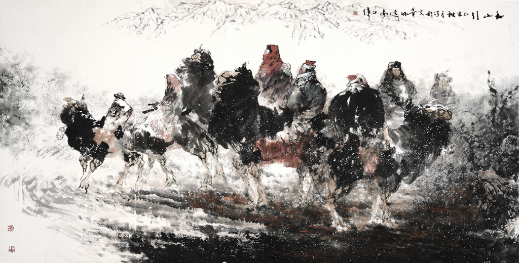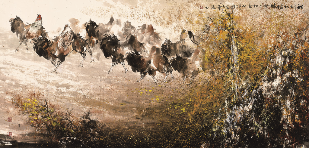 胡正伟先生长期保持追变求真的习惯,在造型方面做到轻而易举、挥散自如、得心应手,尤其表现西部骆驼的水墨画,干皴渴擦加以书法用笔的线条赋予骆驼以灵动、洒脱、飘逸的视觉美感,中锋、侧锋、逆锋运用于画面中的表现,精微之处在勾皴的基础上敷以水润墨色,形成了他画面特有的线与面、笔与墨、疏与密、虚与实、光与影的辩证关系,很好的保持笔墨的控制力,其效果都能超越以形写神,率性而不粗野、简洁而不空疏、洒脱而不恣肆,又体现出笔墨意蕴和西部风情,这种古朴厚重的笔墨之中,表现西部生活中鲜活与生动的骆驼形象,先生的作品不仅体现了他自己的艺术风格与绘画面貌,而且也充分塑造了符合时代特点的审美趣味。